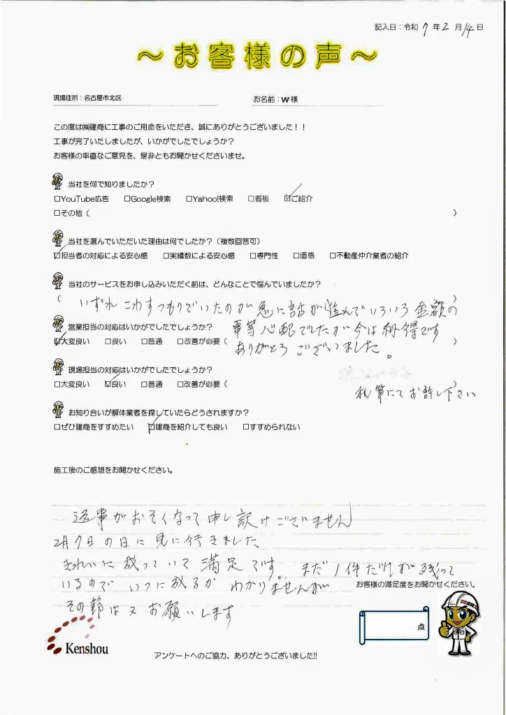 名古屋市北区 W様返事が遅くなって申し訳ありません。2月7日に見にいきました。