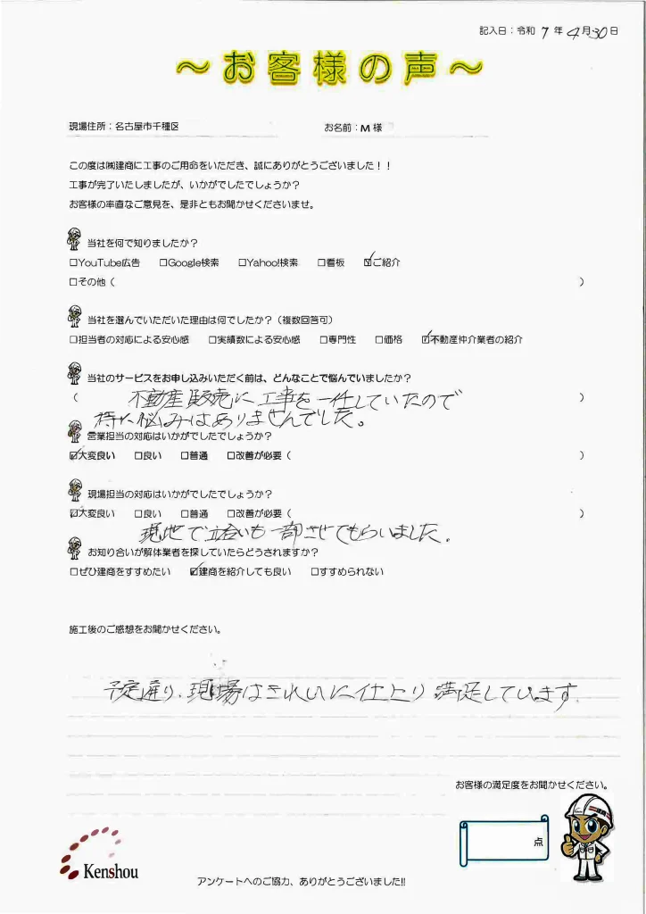名古屋市千種区 M様予定通り、現場はきれいに仕上がり満足しています。