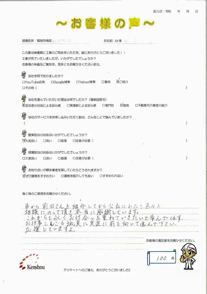 福岡市南区 O様弟から前田さんを紹介してから公私にわたり色々と相談にのっていただき本当に感謝しています。